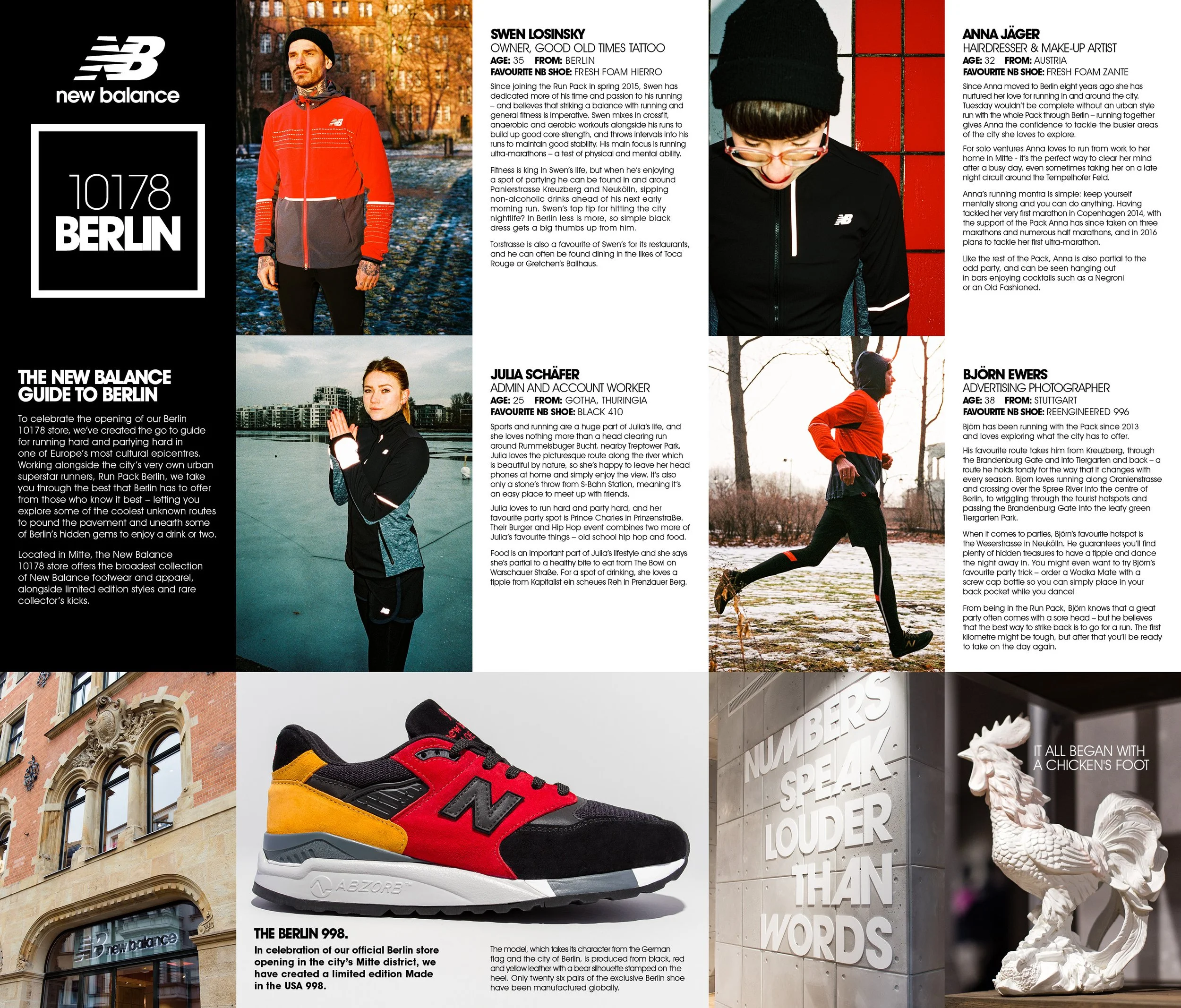 Our worked spanned sports and lifestyle, introducing new products to the world and generating awareness whilst protecting the brand’s heritage and authenticity. Creating a world where fashion press, stylists and designers, sports stars and music talent all merge and the New Balance community grows. I provided creative support for print design, spacial design for events, merch, motion and even some product photography for the limited edition Berlin 998 which featured in the international press.